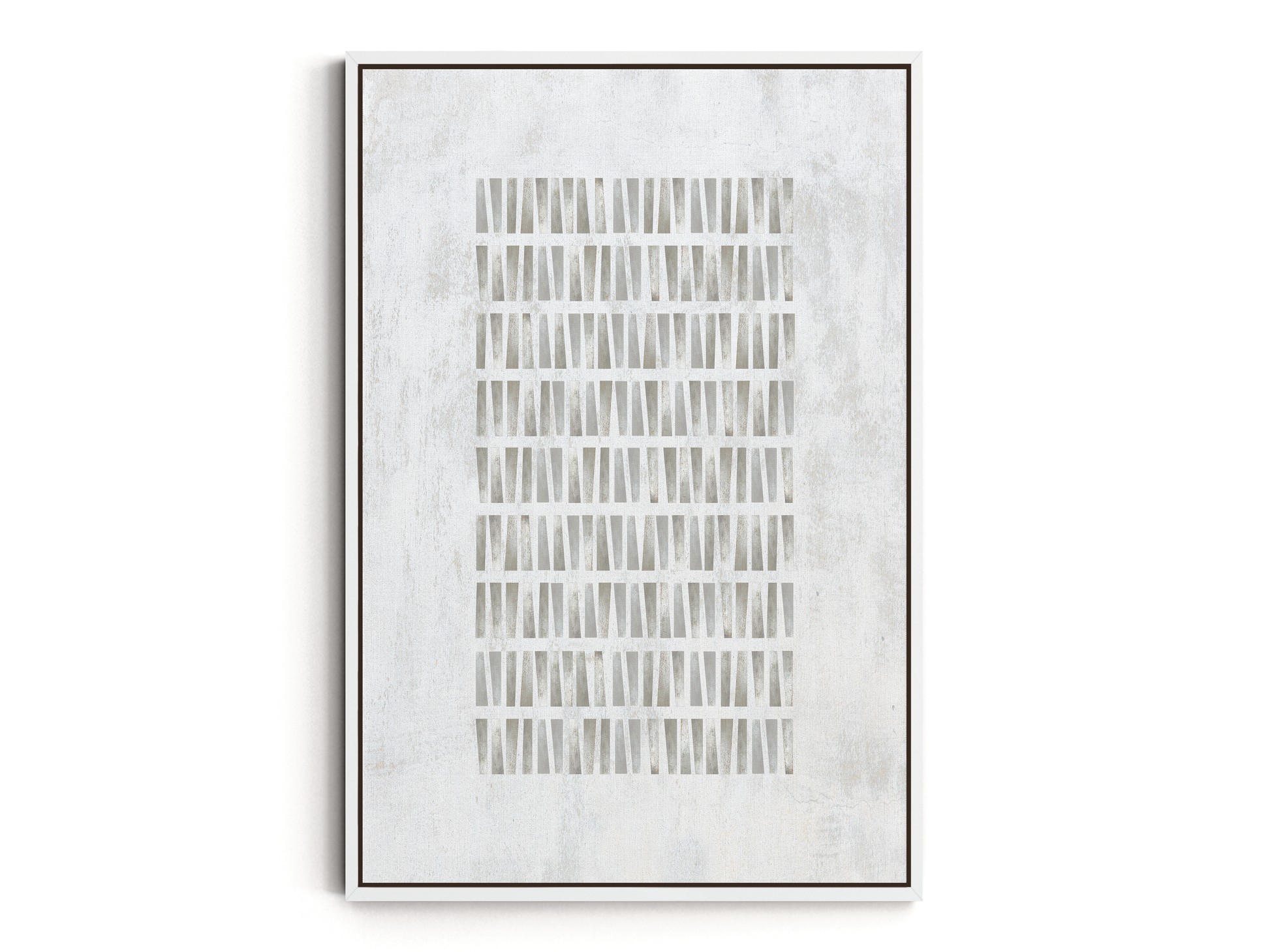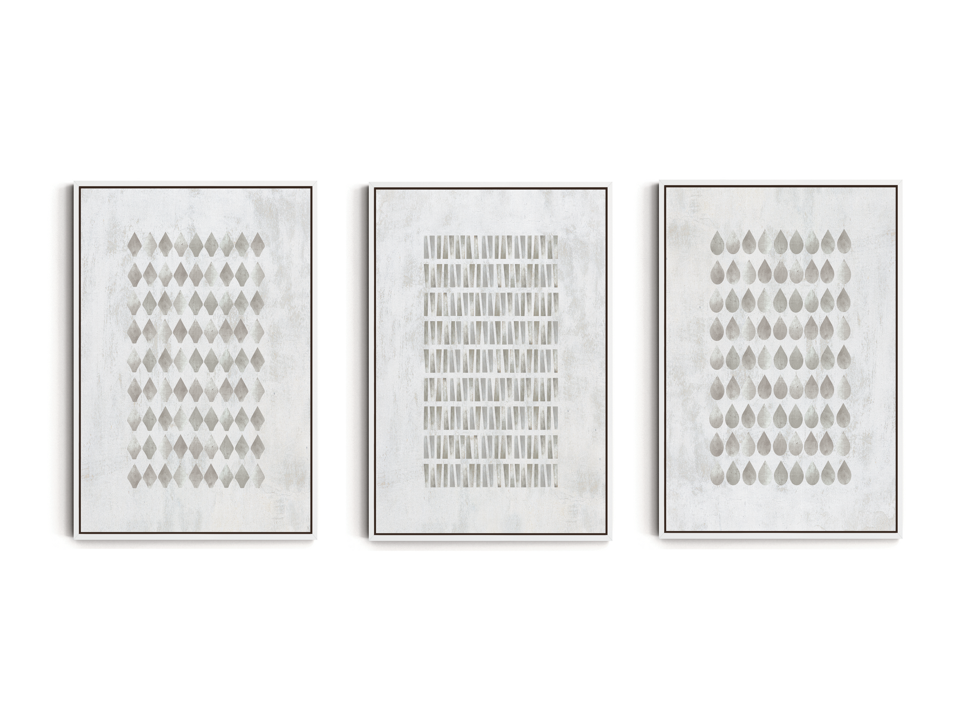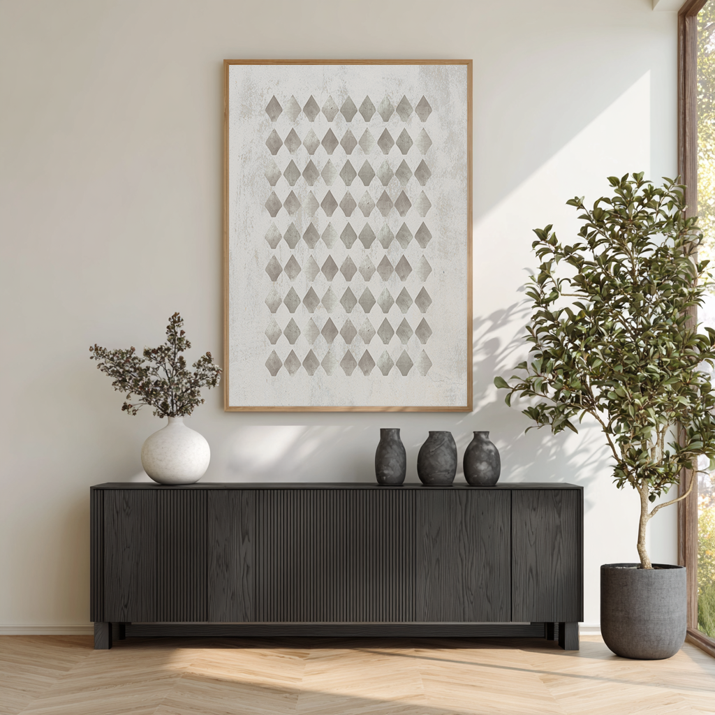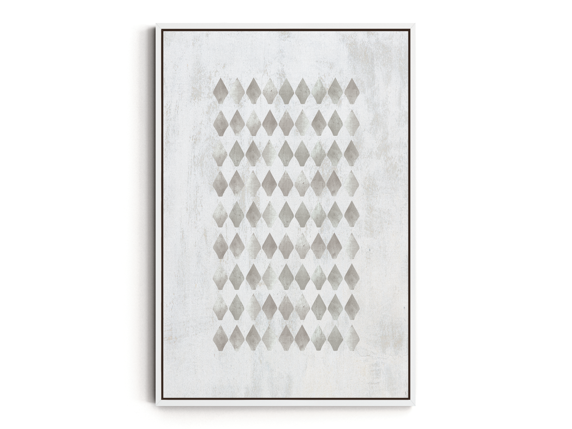 This combination plays with shape and subtle tone—clean forms like diamond and line set against fluid raindrop movement. This is a quote from Rimmy about the artwork inspiration.